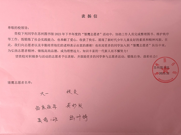 近日,我院收到多封来自苏州图书馆的感谢信,信中对我院学生参与2023年下半年“雏鹰志愿者”工作给予充分肯定,向我院表达真诚的谢意。